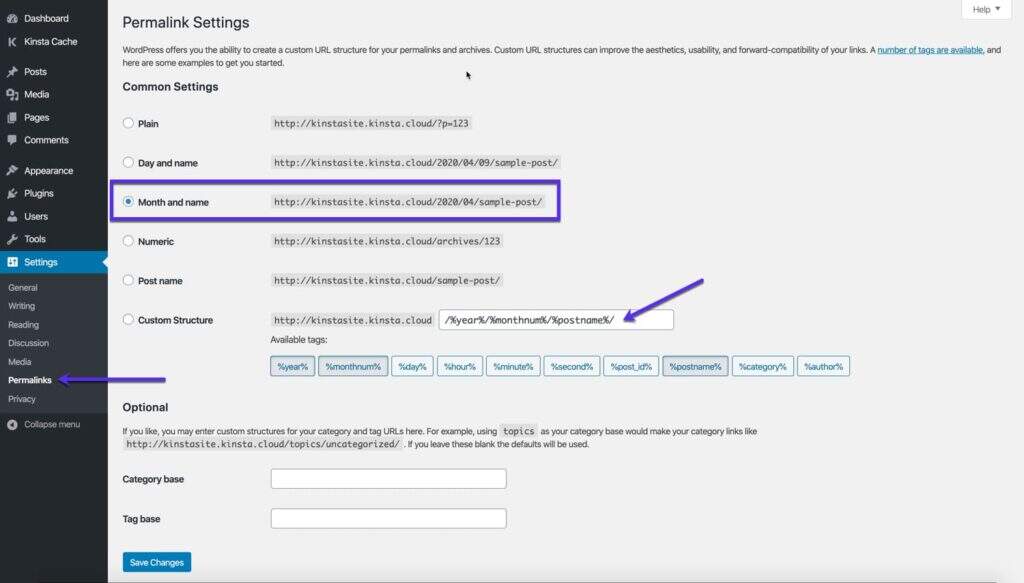 例如,如果您创建固定链接结构Month and name,WordPress将在文章发布的年份和月份之后附加您的slug: