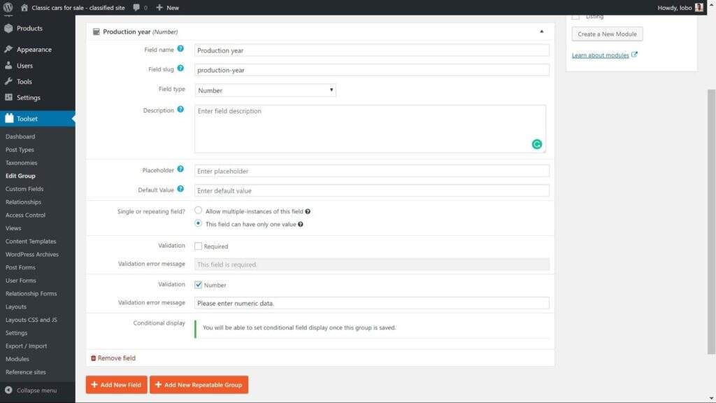现在我们可以恢复了。让我们继续展示我如何显示Production year的自定义字段,您可以在我的模板下图中看到: