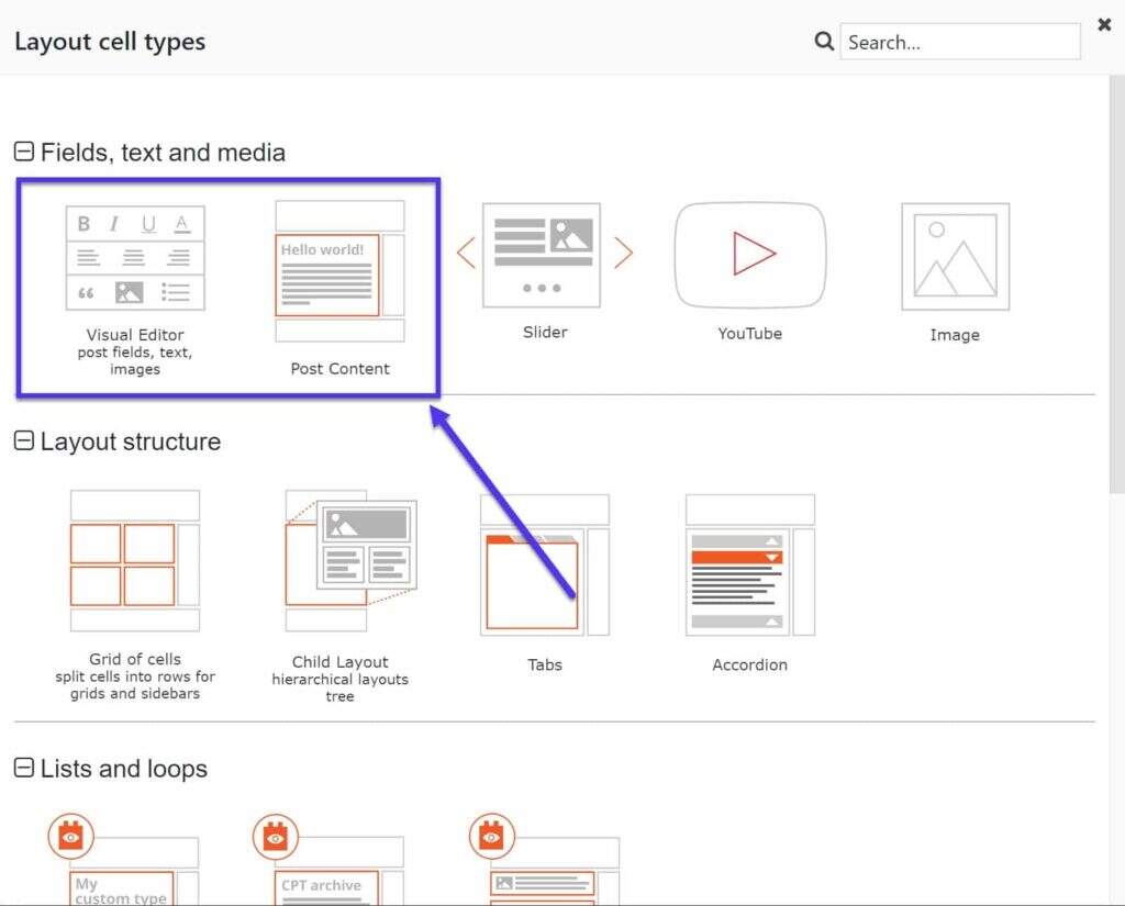 3. 您现在将看到您已经熟悉的布局单元类型列表。选择可视化编辑器Visual editor。