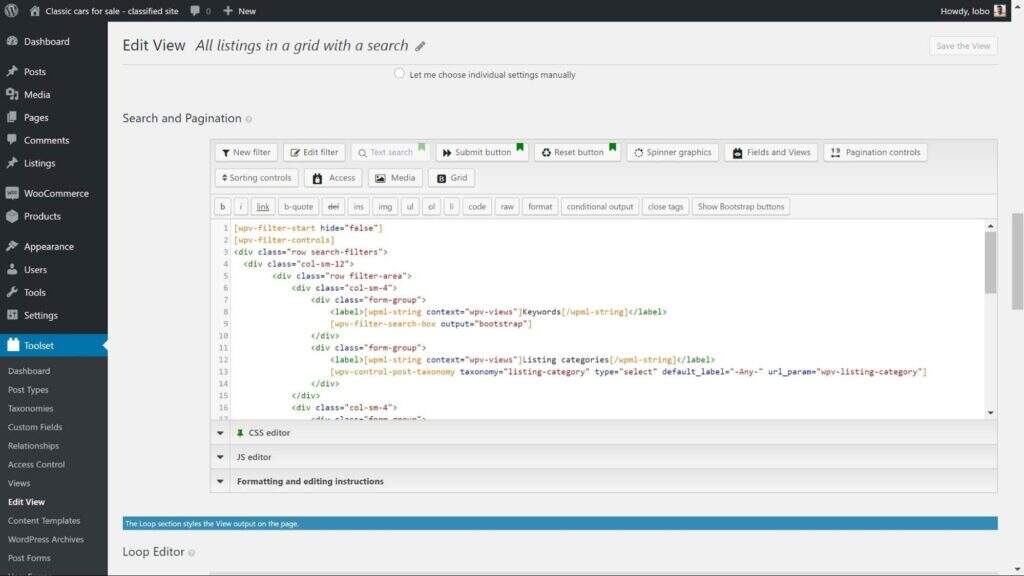 在Search and Pagination下,我们可以找到另一个称为Loop Editor的部分,我们可以在其中设计结果的输出。