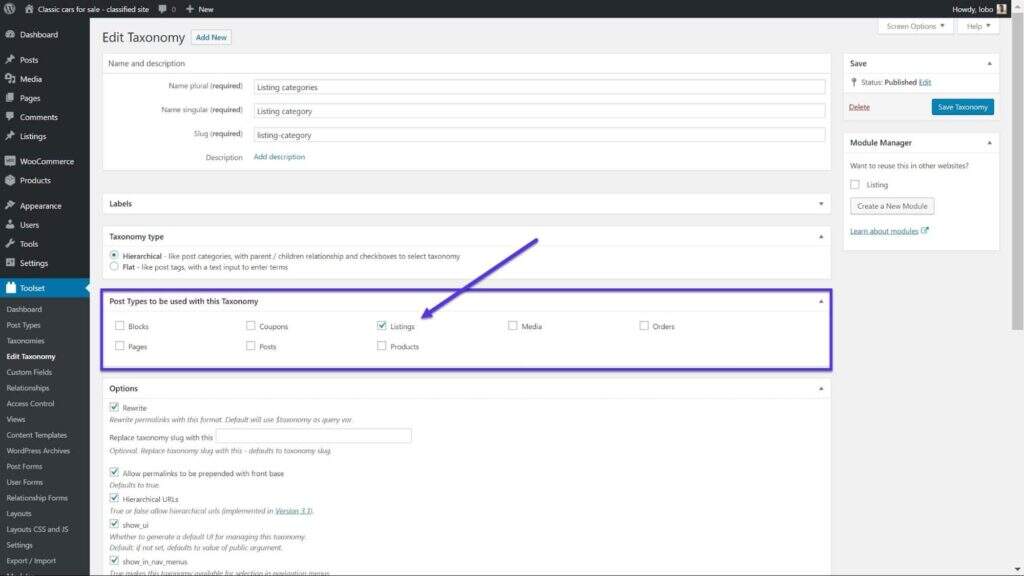 4. 选择您要为其分配这些分类的文章类型。在我的示例中,我已将它们分配给Listings自定义文章类型。