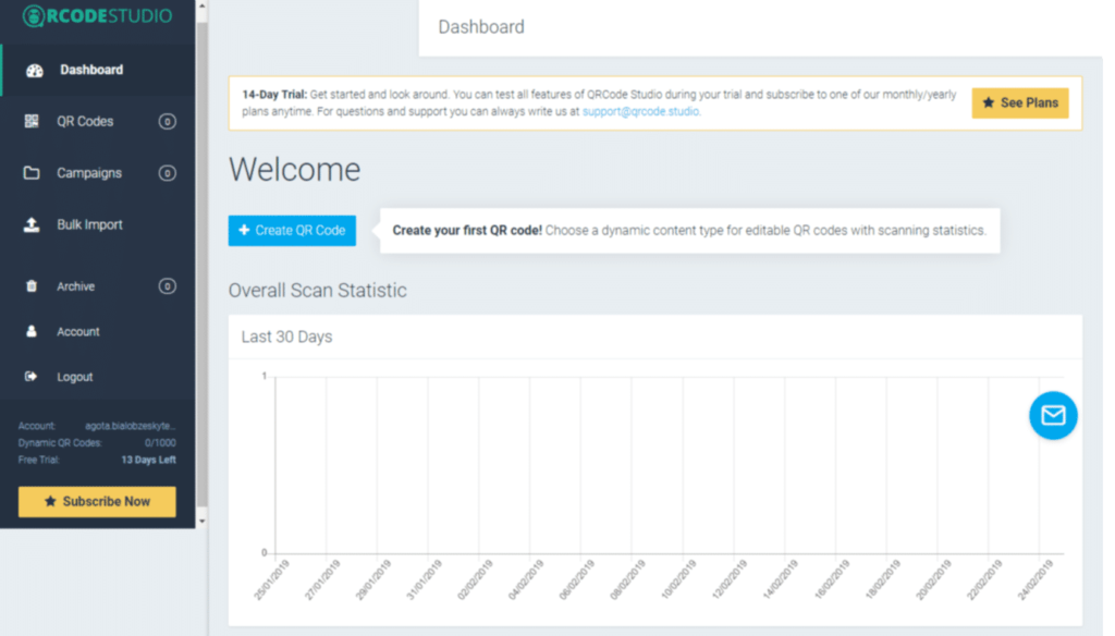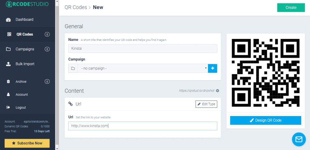 然后单击 仪表板上的“Create QR Code”按钮。