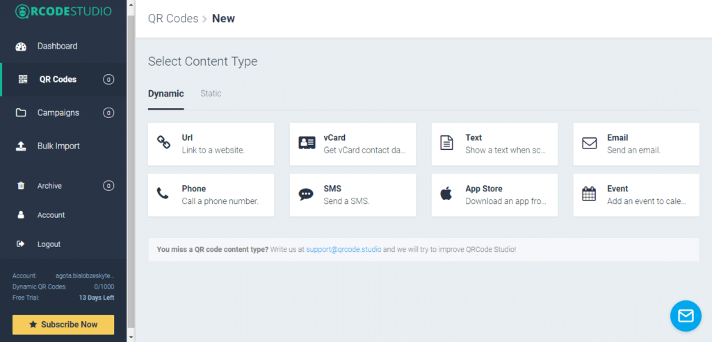 - 生成动态二维码的能力:动态代码意味着您可以修改静态代码无法做到的数据。例如,如果您使用静态代码,那么您无法更改它指向的网站,同时如果您使用动态代码,则可以。如果需要,您希望可以选择进行更改。