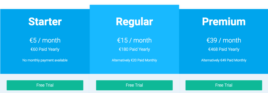 共有三种计划:入门(5 欧元/月或60欧元/年)、常规(15欧元/月或180欧元/年)和高级(39欧元/月或468欧元/年)。