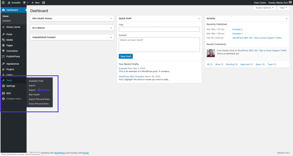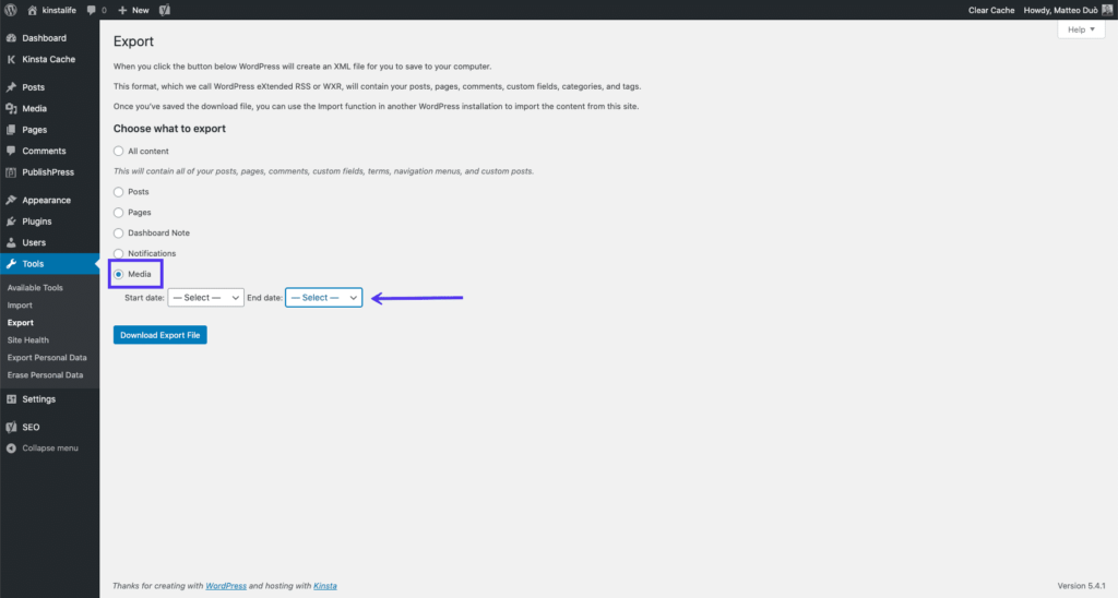 在某些情况下,您可能需要将文件从媒体库下载到计算机上。WordPress使您可以通过导航到工具 > 导出来本地执行此操作: