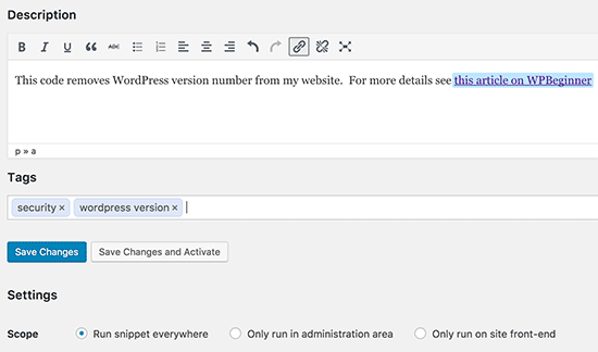 如果您只想保存代码片段而不激活它,那么您可以单击“Save Changes”按钮。