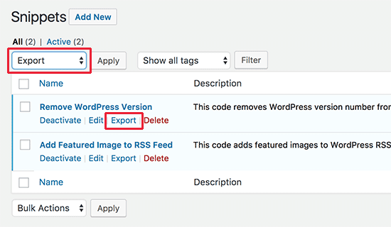 您可以保存代码片段而无需在您的网站上激活它们。您可以随时停用该代码段。您还可以导出特定的代码片段或批量导出所有代码片段。