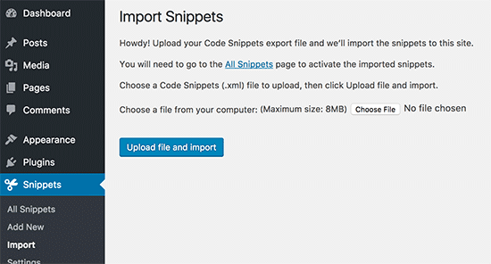 如果您要将网站移动到不同的服务器,您可以通过访问Snippets » Import页面,使用代码片段插件轻松导入代码片段。