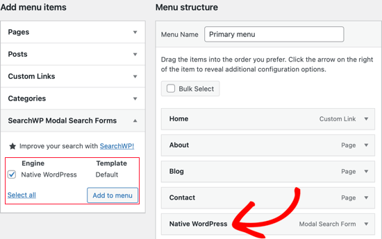 新的Native WordPress Modal Search Form菜单项将添加到右列。您需要单击它以展开其设置。