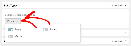 之后,单击“Posts”选项以显示展开的菜单。然后,打开“Search posts of only selected taxonomies”切换开关。