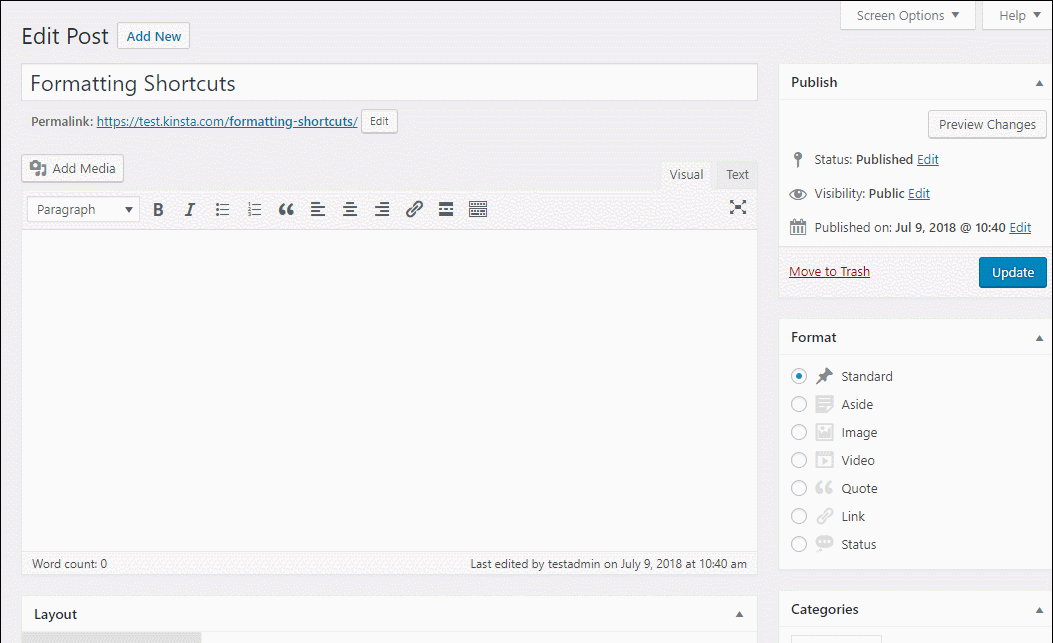 与上面的键盘快捷键不同,您可以通过在WordPress编辑器中实际输入内容来激活格式快捷键。您必须使用Visual选项卡才能使这些快捷键工作。