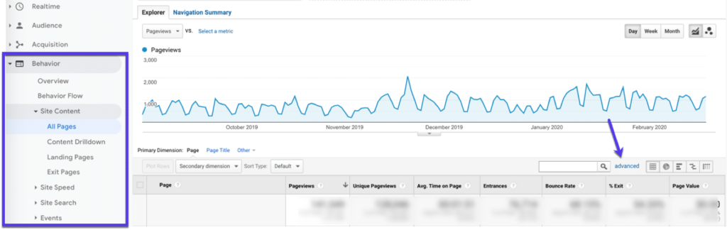 在Google Analytics中,转到Behavior > Site Content > All Pages并点击Advanced: