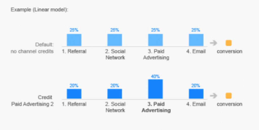- 线性归因——对访问者旅程中的每个接触点给予同等的信任。