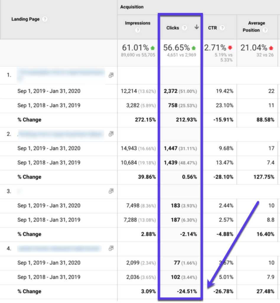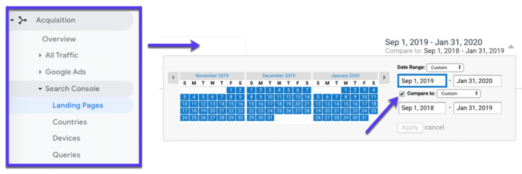 转到Acquisition > Search Console > Landing Pages并选择一个时间范围(目标至少为6个月),然后将其与上一年进行比较: