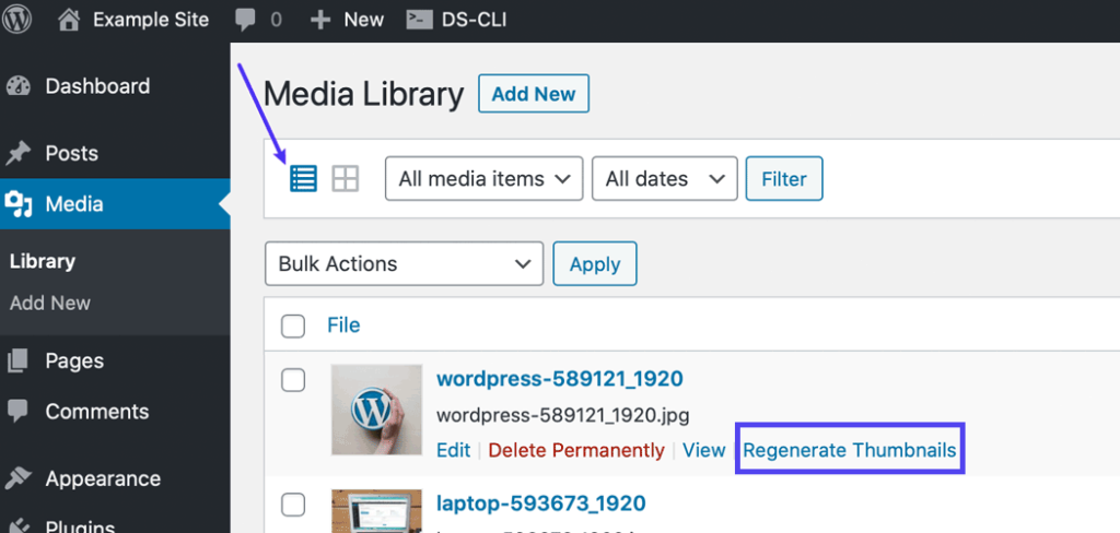 如果您正在列表视图中查看媒体库,请将鼠标悬停在要重新生成的图像上后单击Regenerate Thumbnails链接。