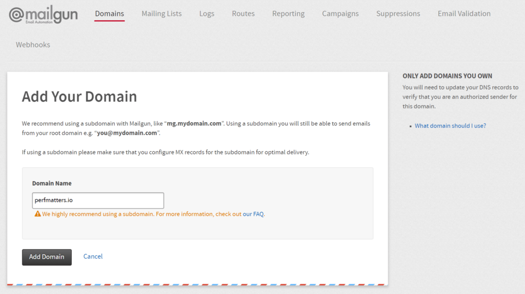 接下来,您需要配置域以进行交付。Mailgun建议使用子域,例如mg.mydomain.com。以下是他们关于选择域的一些其他建议: