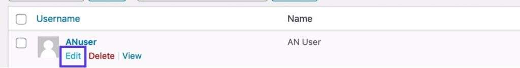 在WordPress管理后台中,转到用户。找到您要保留其密码的用户,然后单击其姓名下方的“编辑”链接。