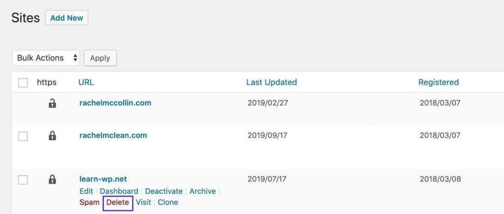 接下来,转到Network Admin > Sites。对于其中的每个站点,单击“删除”链接将其删除。