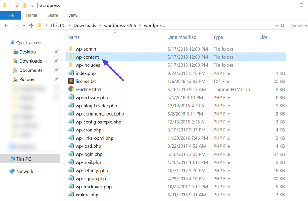 下载完成后,将ZIP文件的完整内容解压缩到您的计算机。然后,删除wp-content文件夹。