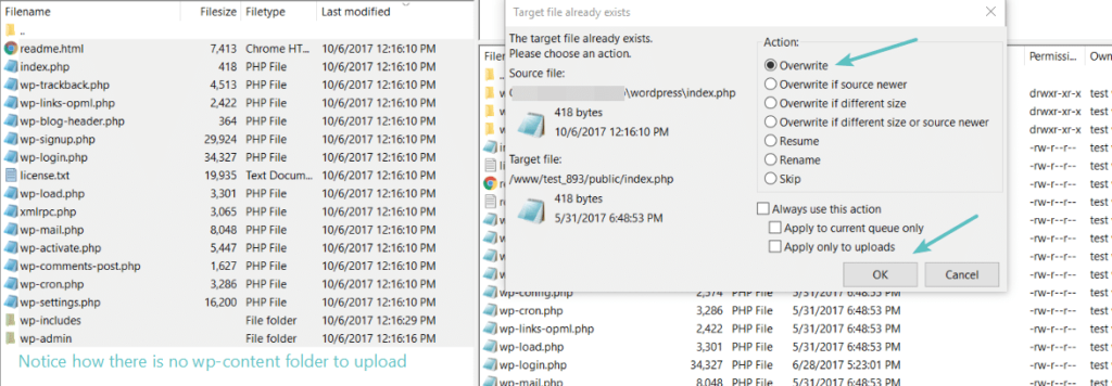 当您开始上传文件时,您的FTP程序应该会提示您一条消息,说类似于Target file already exists。发生这种情况时,请确保选择覆盖选项并继续: