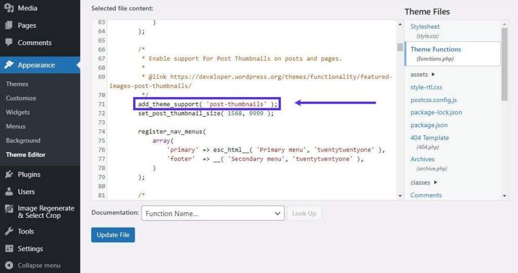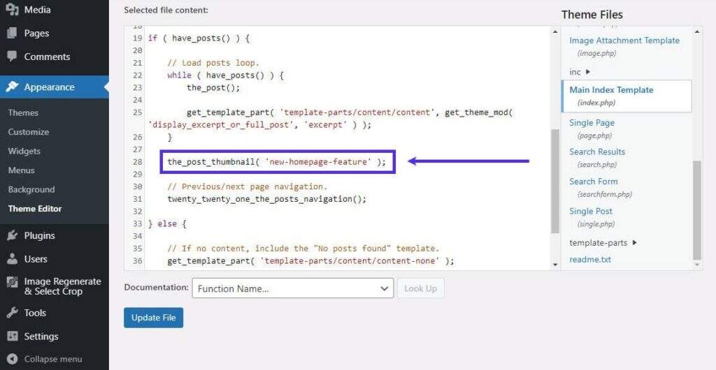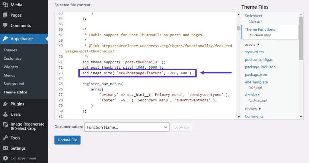 添加此代码后,单击底部的“更新文件”按钮以激活允许您创建自定义图像大小的功能。