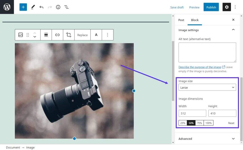 如果您使用的是Gutenberg,则可以在创建文章期间添加图像时快速编辑图像的图像大小。