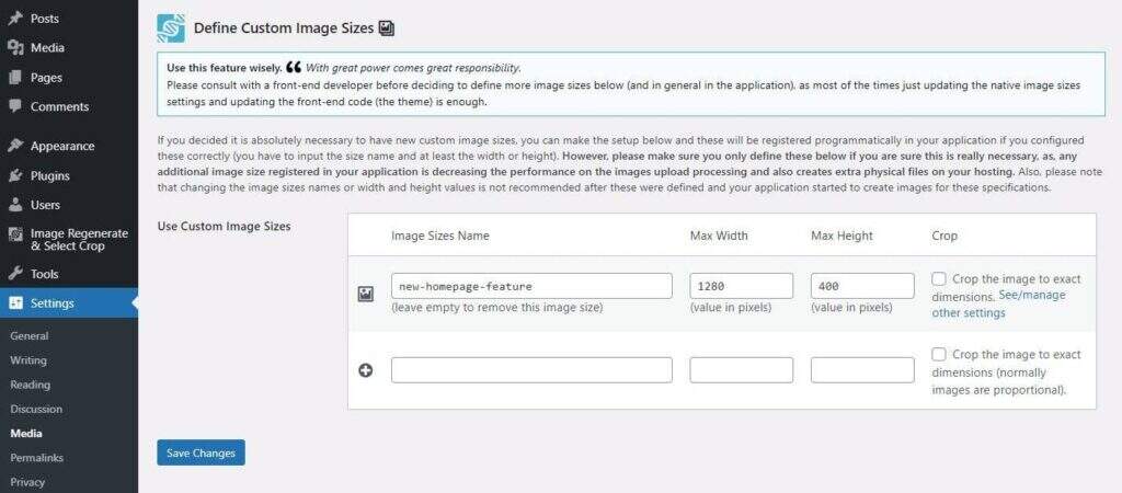 除了让您更改默认图像大小之外,它还使您能够重新生成任何现有图像以匹配您首选的图像大小、设置图片的默认裁剪选项以及重新生成缩略图。