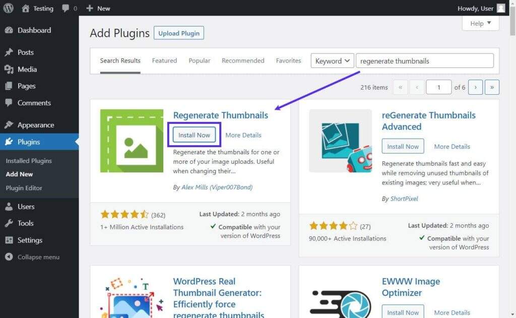 要安装它,请将鼠标悬停在Plugins菜单选项上,然后单击Add New。然后在搜索框中输入“Regenerate Thumbnails”。