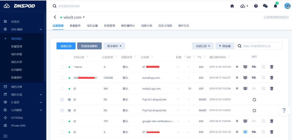 即使您使用包含的高级DNSPod,您仍然需要设置A记录和CNAME记录才能将您的域与服务器一起使用。