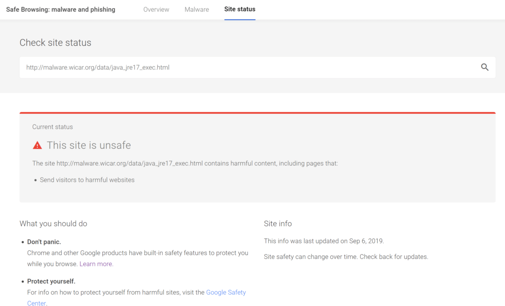 要验证您的网站是否存在问题,您可以通过Google安全浏览工具手动运行您的网站。