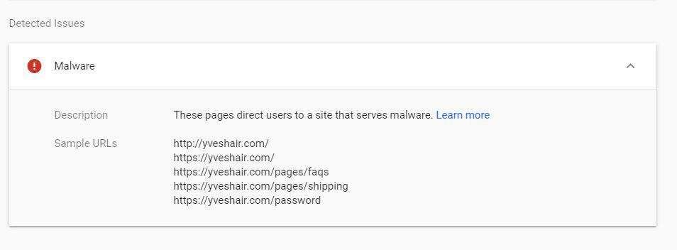 首先,如果您从Google Search Console收到有关您网站上恶意代码的通知,它通常会提供有关该问题的一些见解。有时这可能只是受感染URL的列表,而有时Google可能会列出问题所在的恶意代码: