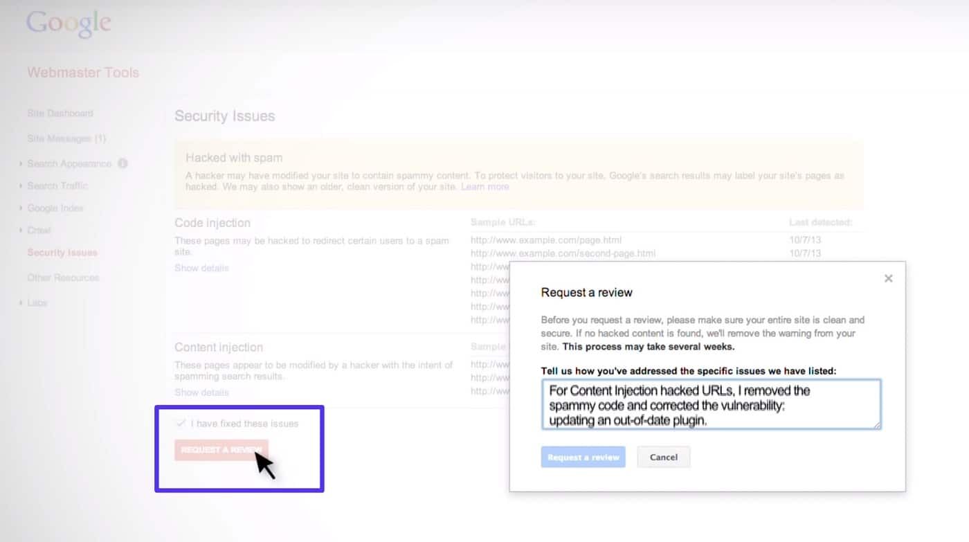 登陆Google Search Console,转到安全和手动操作中的安全问题部分。选中该框以表明我已解决这些问题,然后单击Request a Review。