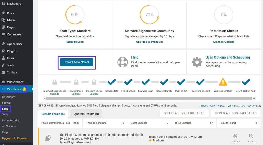 安装并激活插件后,您可以转到Wordfence → Scan以运行恶意软件扫描: