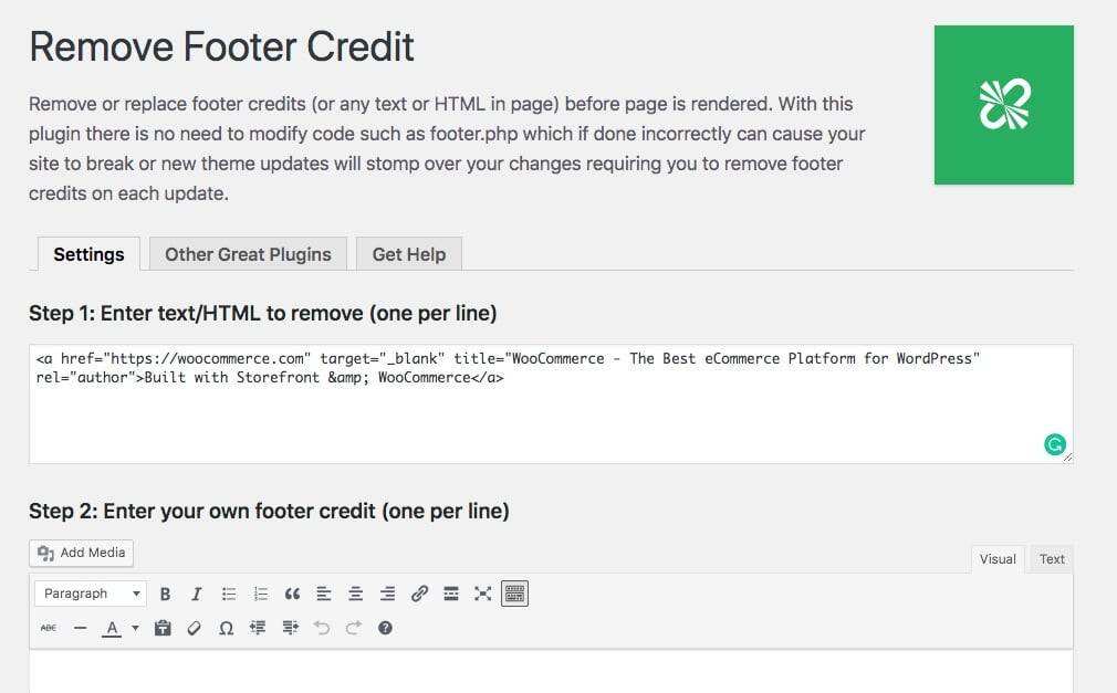 复制整行HTML,包括链接,然后将其粘贴到Remove Footer Credit设置屏幕的第一个字段中: