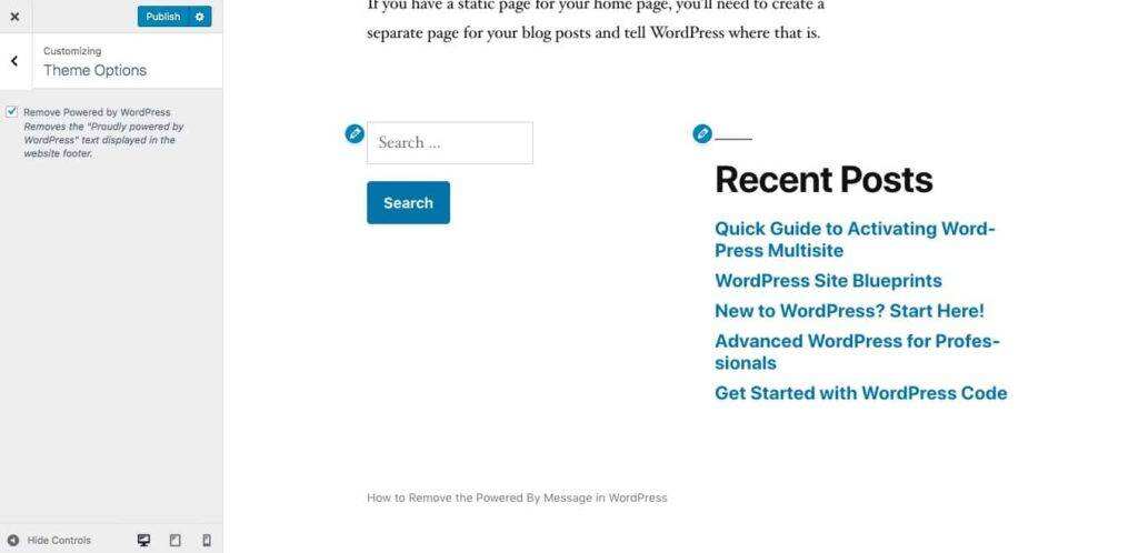 激活插件,它会在定制器的“主题选项”屏幕中添加一个复选框,让您可以打开和关闭“Powered by WordPress”消息。