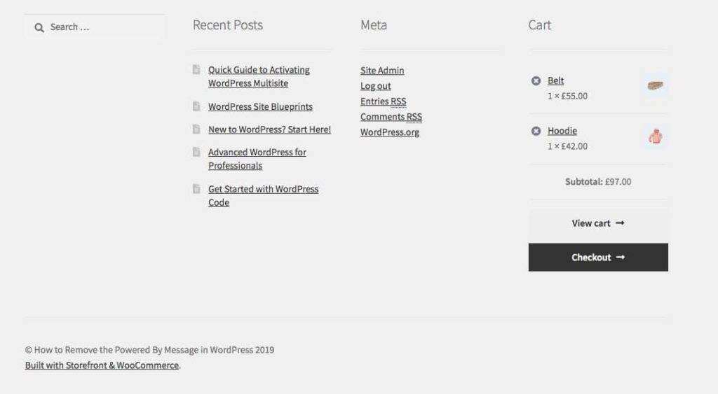 然而,这只会删除默认的“Powered by WordPress”文本:它不会删除任何链接到主题开发人员的自定义消息,正如您在下面为WooCommerce激活店面主题的站点中所见。