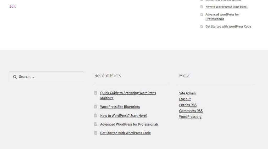 这个页脚包括我添加到页脚小工具区域的两个小工具和一个带有站点名称和“powered by WordPress”信息的版权页。