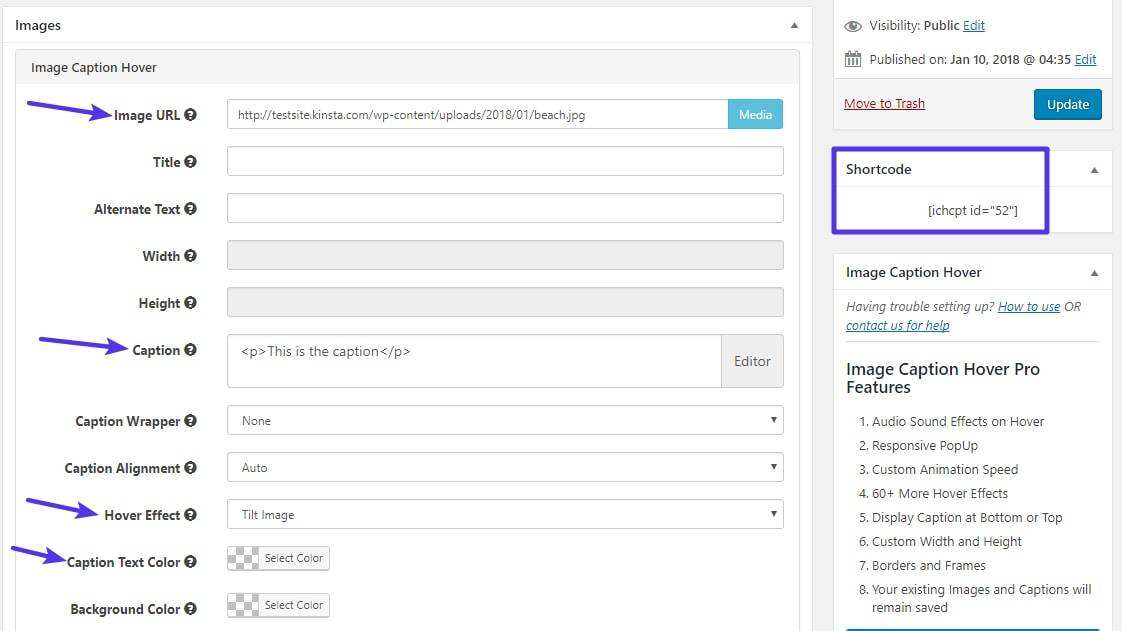 要使用插件为图像添加说明文字,您首先需要使用插件的标题构建器来选择悬停效果并输入说明文字的详细信息。然后,您可以使用提供的简码在WordPress网站上的任何位置插入图像和说明文字:
