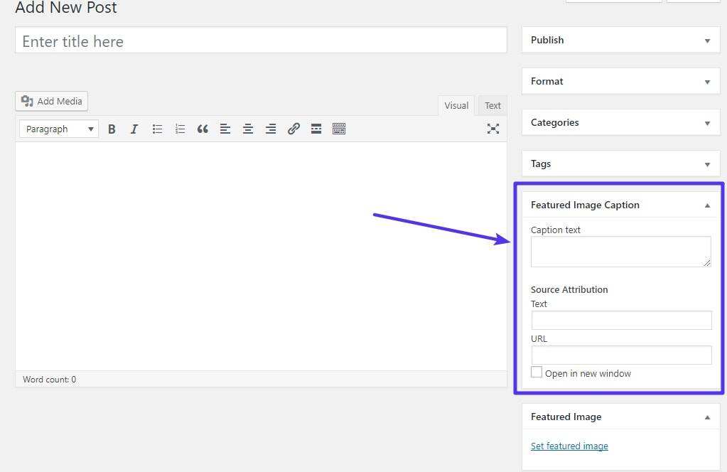 安装并启用插件后,您将在WordPress编辑器的侧边栏中获得一个新的特色图片说明文字框:
