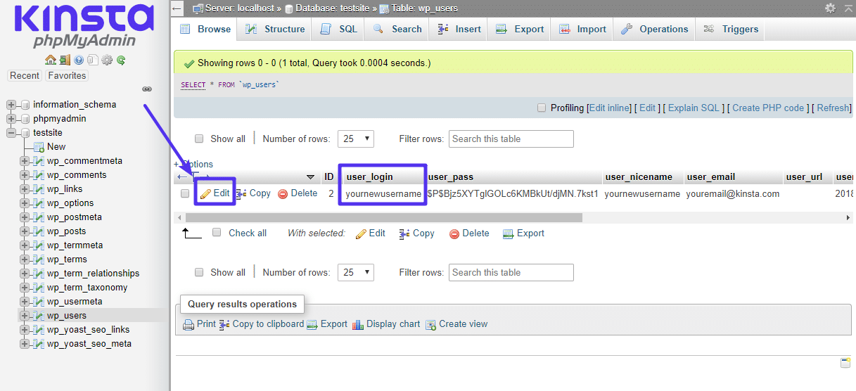 登录到phpMyAdmin后,在左侧选择您站点的数据库。然后,单击wp_users表: