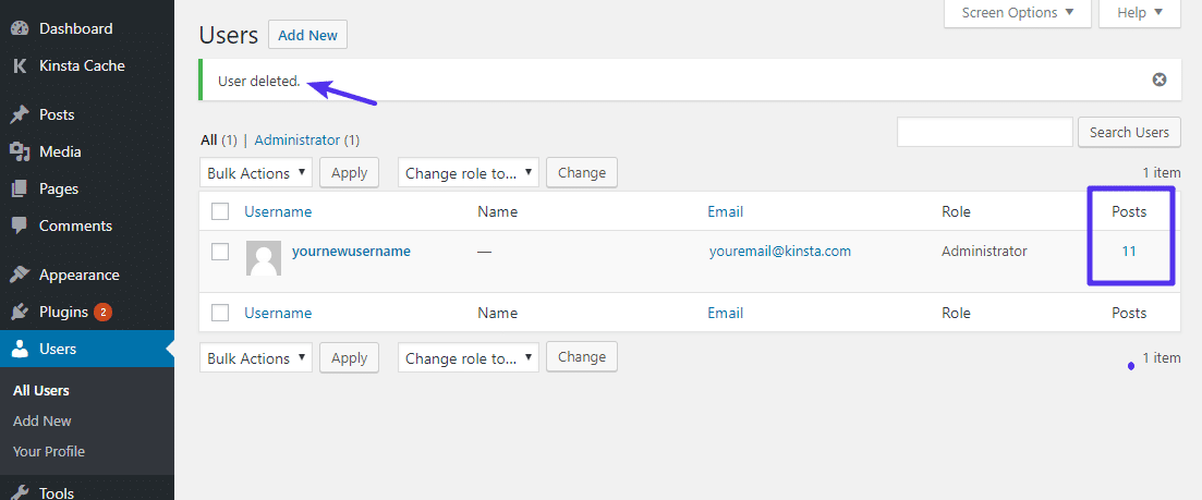 完成后,转到WordPress仪表盘中的“用户”选项卡并删除您的旧用户名:
