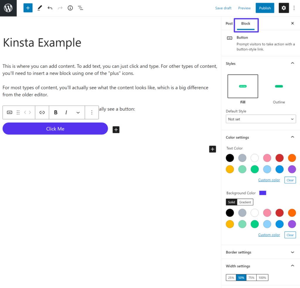 要打开区块的设置,请在编辑器中单击块以选择它。然后,转到边栏中的“区块”选项卡以查看其设置。