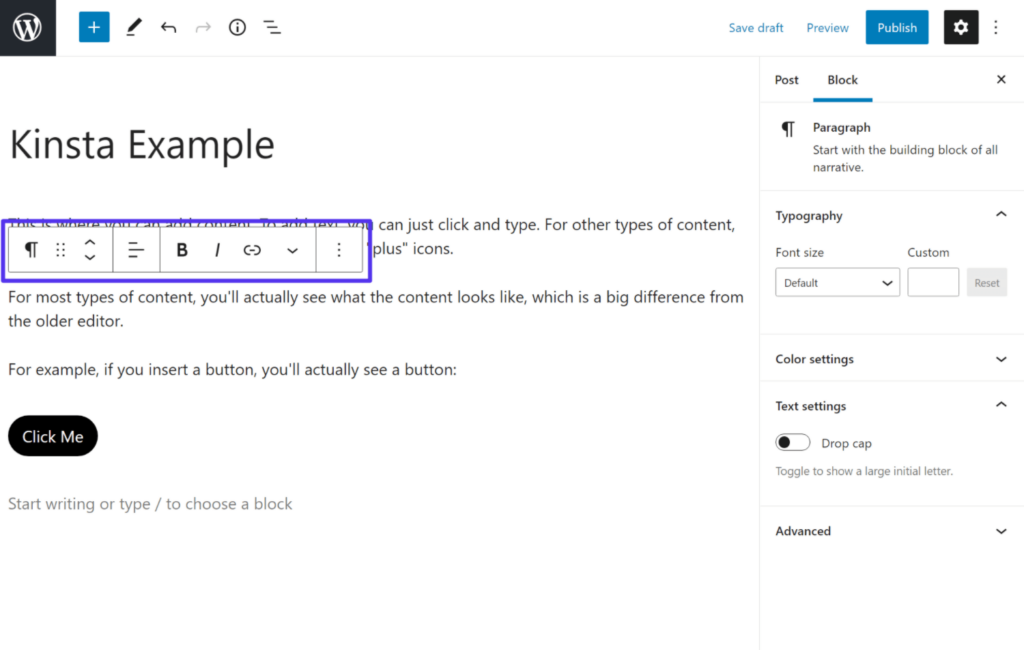 要将常规段落文本添加到您的文章中,您只需单击并键入即可。每次按 Enter 键时,编辑器都会自动创建一个新的段落区块。