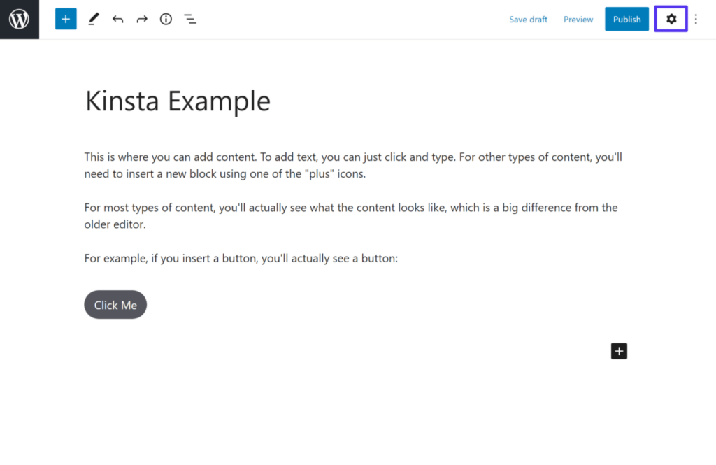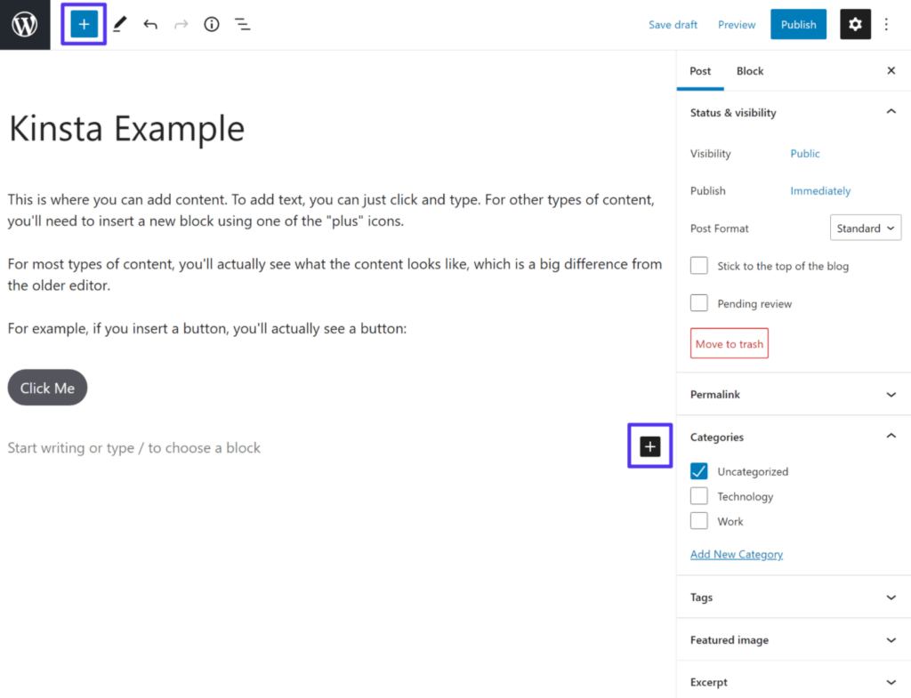 要添加新区块,您可以单击界面中的“加号”图标之一。它是左上角的主要区块插入器图标,但您还会在界面内看到其他图标,用于打开较小的区块插入器界面: