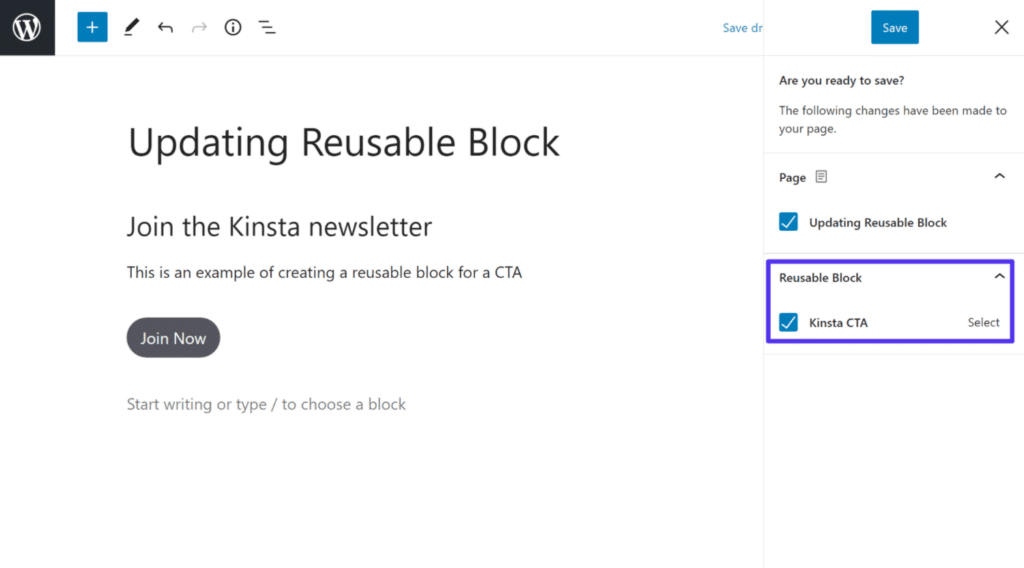 如果您更改可重用区块,您将在更新文章时获得发布这些更改的选项。如果您决定发布可重用区块更改,这些更改将自动应用于可重用块的每个实例: