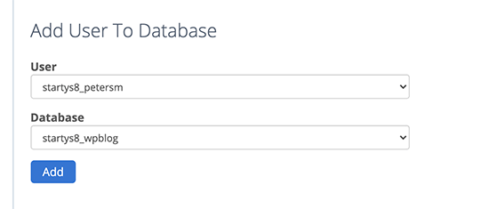 向下滚动到“Add User to Database”部分。首先从“User”字段旁边的下拉菜单中选择您创建的数据库用户。然后选择您刚刚创建的新数据库并单击“Add”按钮。