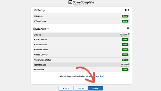Duplicator现在将运行网站Duplicator向导。首先,它将运行一些测试以查看是否一切正常。如果插件发现问题,您将看到带有说明的警告。