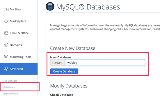 注意:您的主机控制面板可能与屏幕截图略有不同。但是,您仍然应该能够找到带有创建新数据库选项的数据库部分。