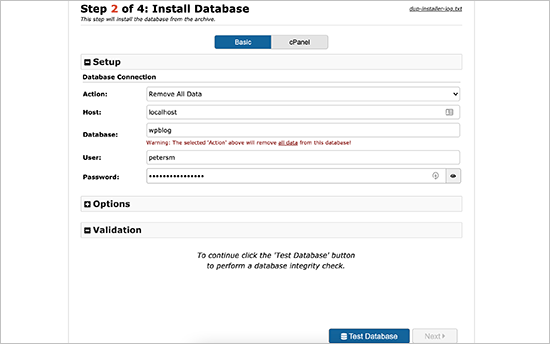 不要忘记用您的新域名替换example.com。这将启动Duplicator迁移向导。