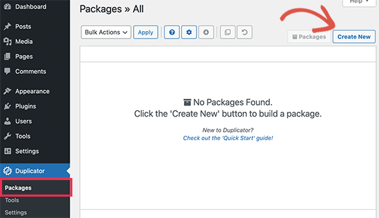 激活后,该插件将在您的WordPress管理后台中添加一个Duplicator菜单项。您需要单击Duplicator菜单,然后单击“Create New”按钮以创建新包或WordPress站点的副本。